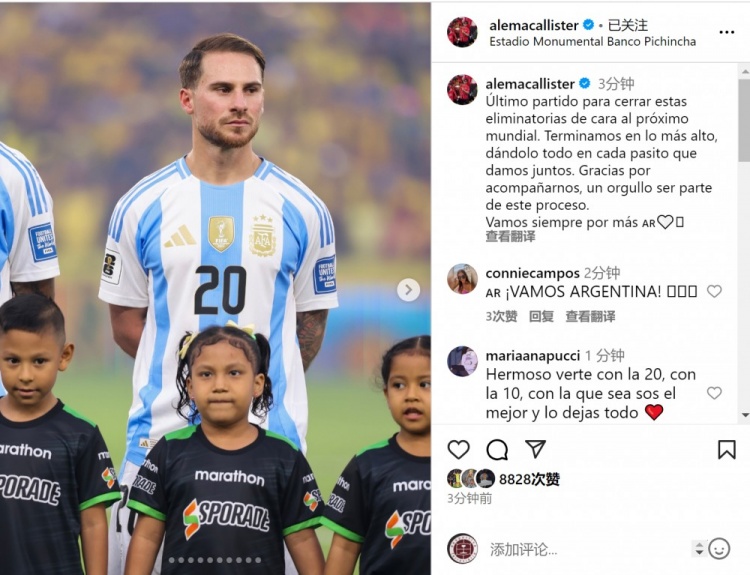 阿根廷中场麦卡利斯特在社交媒体上写道:“最后一场比赛为本次世界杯预选赛画上句号。我们以榜首位置收官,在共同迈出的每一步中倾尽全力。感谢你们的陪伴,能参与其中是我的荣幸。我们永远追求更多。”